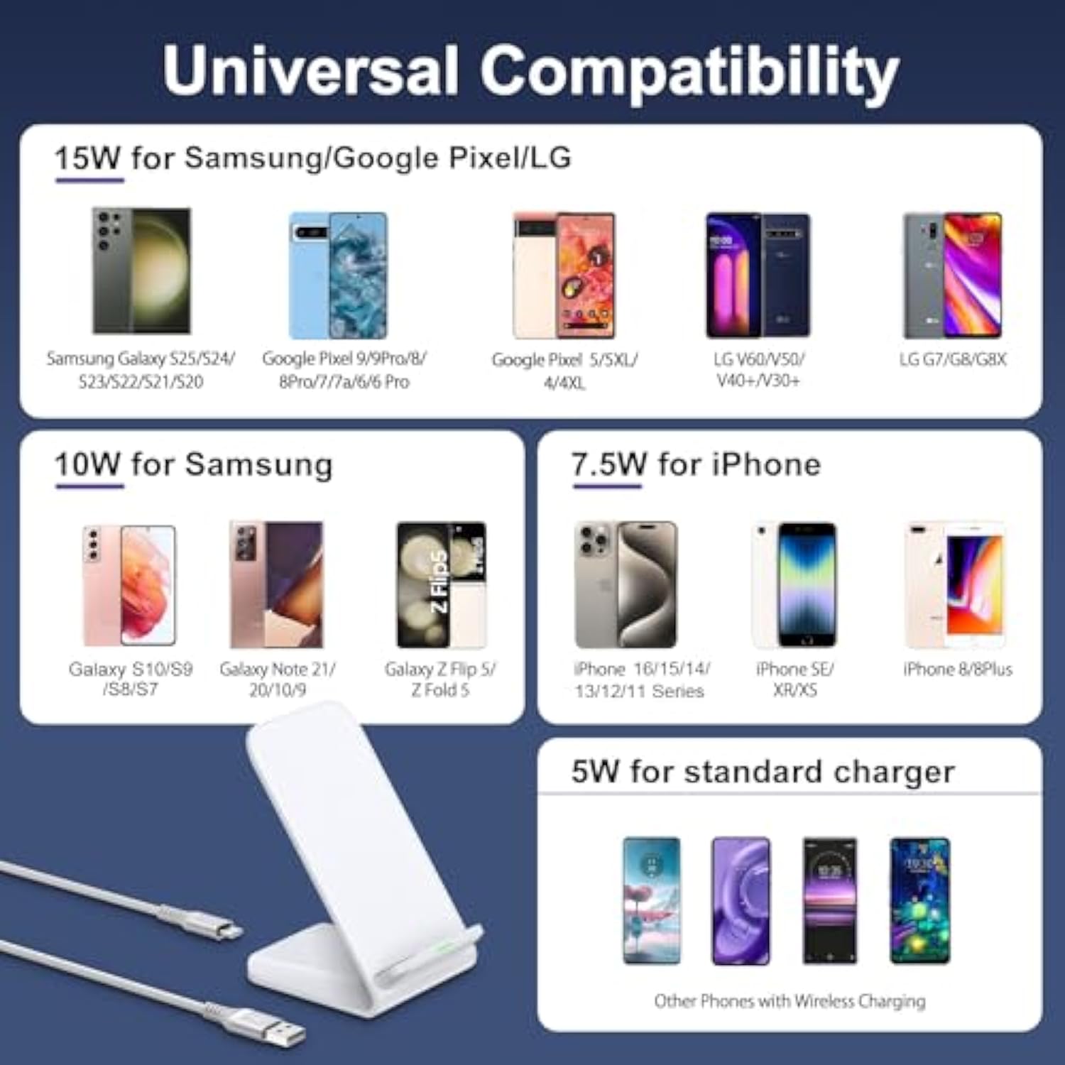 Wide compatibility: this wireless mobile phone charger has 4 charging modes: 15W fast charging for Google Pixel 9/9 Pro/8/8 Pro/8 a/7/7a/6/5/4/3 XL, Samsung Galaxy S25/S25 Ultra/S25 +/S25 Plus/S24/S24 Ultra/S24 Plus/S24 5G/S24 23/S22 3 Ultra/S23+/S22/S21/Z Flip 6/Z Fold 6/Z Flip 5/Z Fold 5; LG G8/G7/V60/V50/V40/V30 10W fast charge for Samsung Galaxy S20/S20 FE/S10/S10E/S10+/S9/S8/Note 20/10/9/8. 7.5W fast charging for iPhone 16/16Plus/16Pro/16Pro Max/16e/15/15 Plus/15 Pro/15 Pro Max/14/13/12/11/SE/XR/XS/X/8/8Plus. 5W for all devices that support QI wireless charging, such as Huawei, Xiaomi (Note: does not support Samsung Galaxy A/J/M series, iPhone 6 series, iPhone 7 series, Google Pixel 6a)