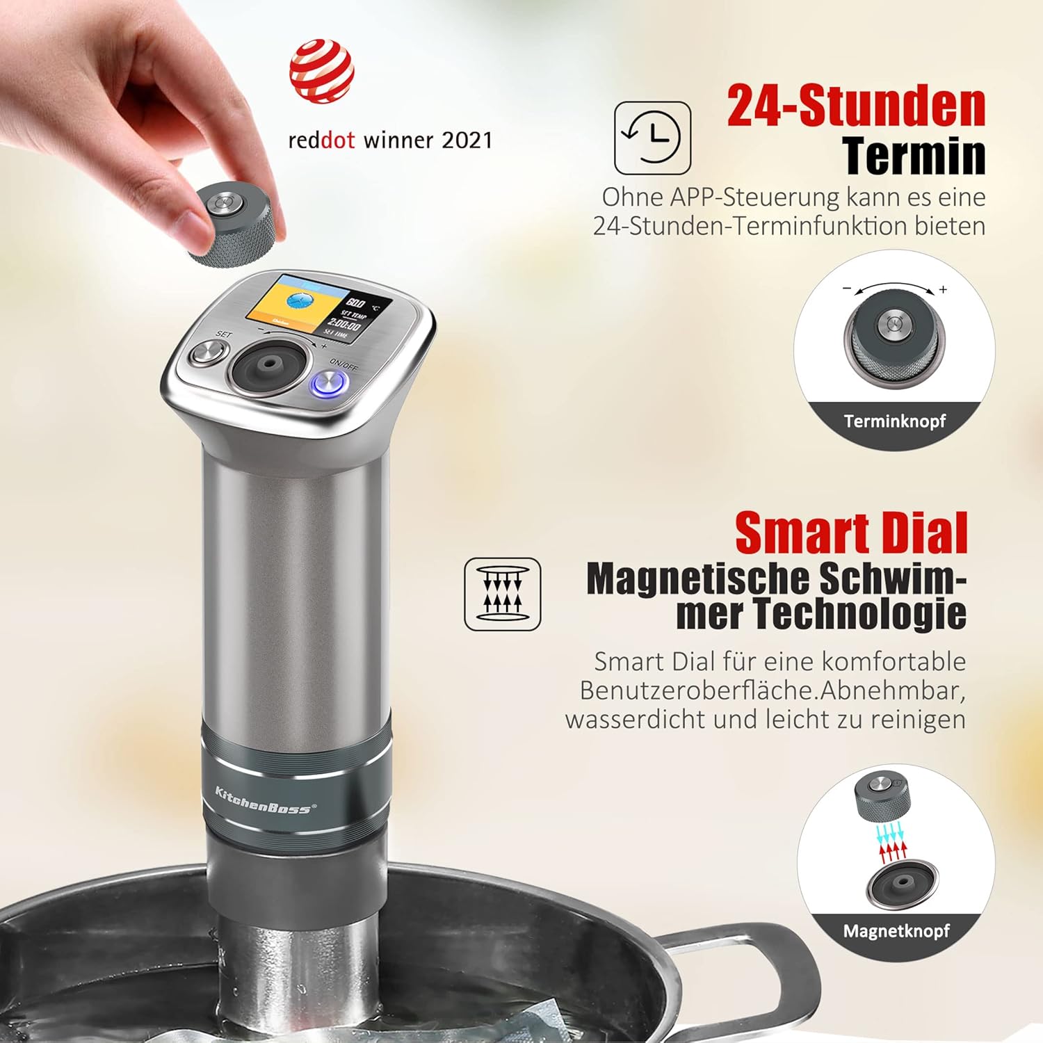 - Wi-Fi Control Seamlessly connect to the "KitchenBoss" app for remote control and monitoring from anywhere. Stay up to date with advances in sous vide technology through app updates.