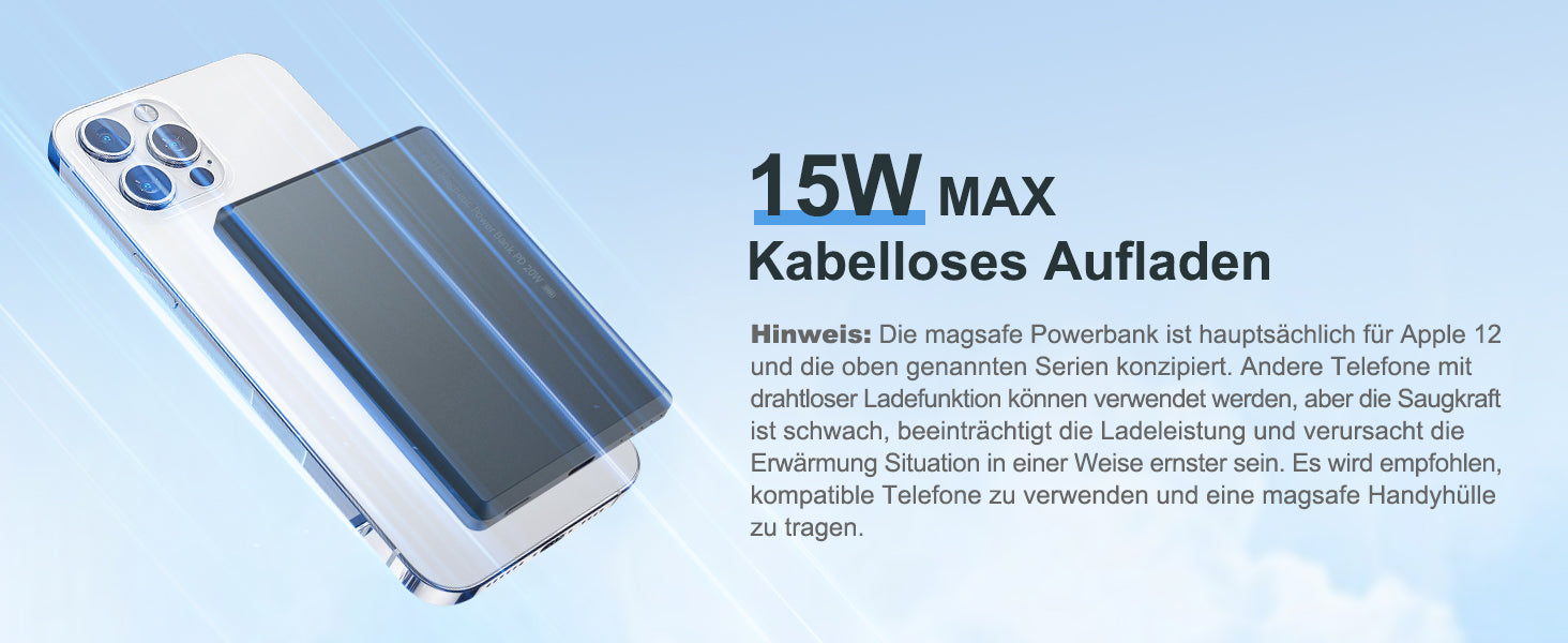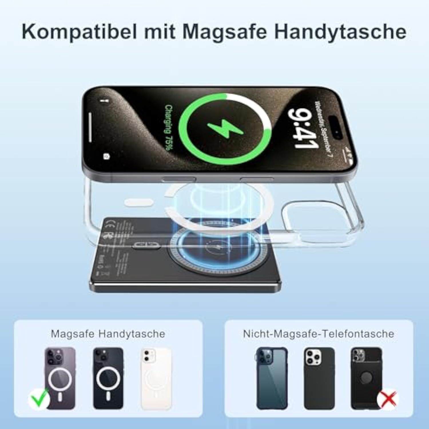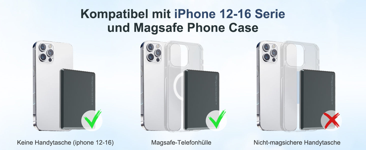 COMPATIBLE WITH MAGNETIC PHONE CASE This slim wireless power bank works seamlessly with MagSafe compatible phone cases, ensuring strong magnetic alignment and stable charging. Experience comfort and uninterrupted charging on the go.