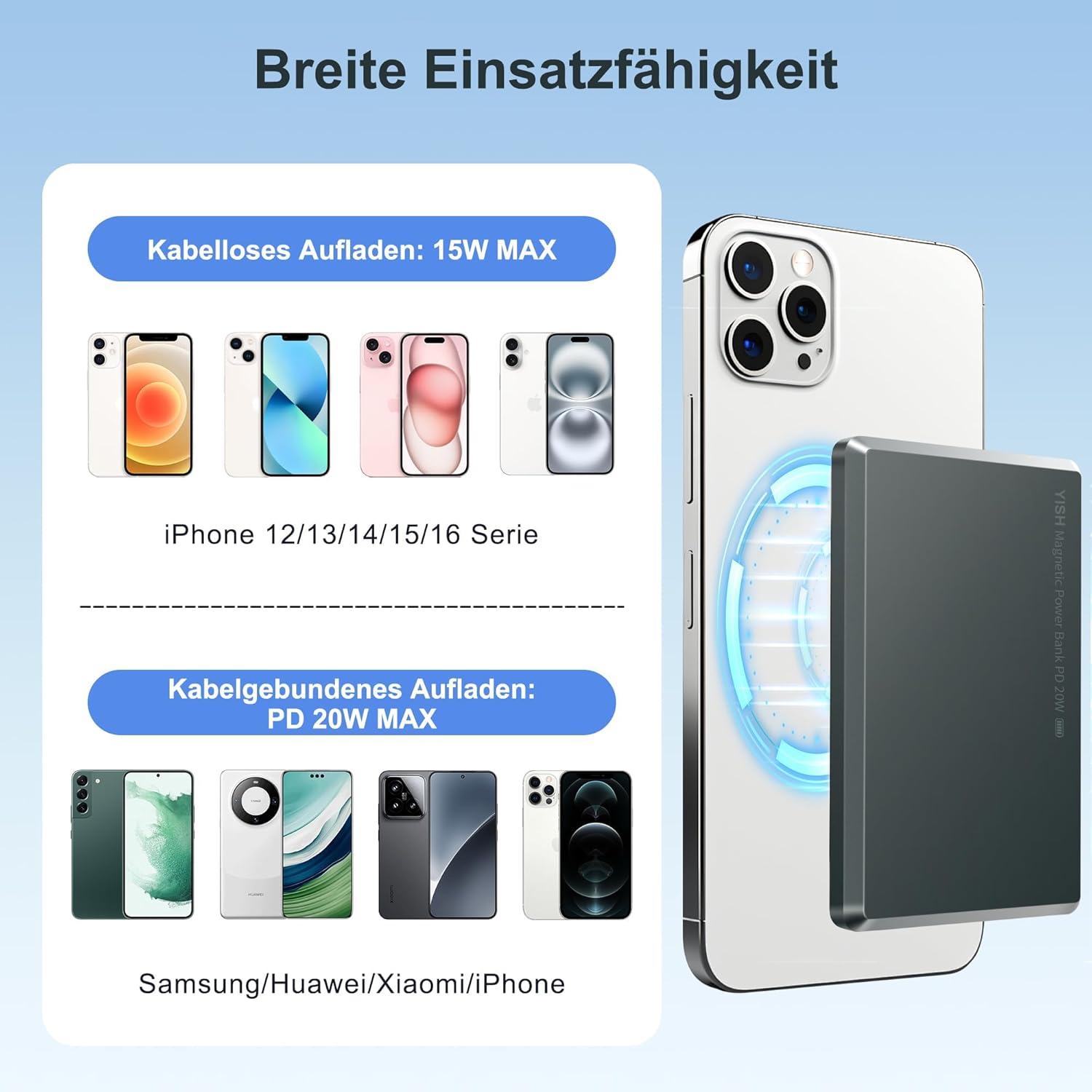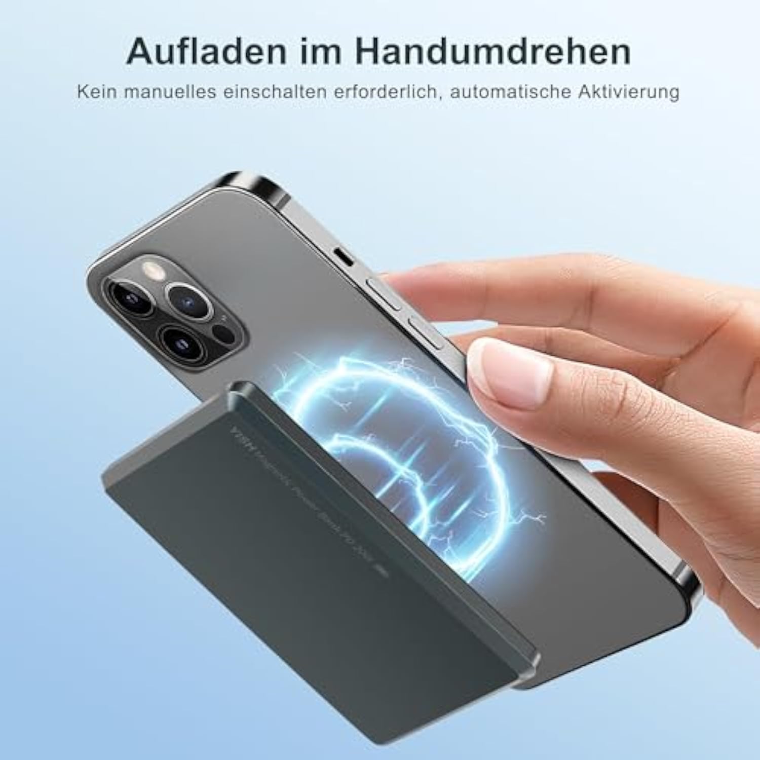 YISH Mag-Safe Powerbank Magnetic Wireless: 5000 mAh Ultra-Slim Magnetic Power Bank, Portable External Battery Pack PD 20 W with Quick Charge USB-C, Compatible with iPhone 16/15/14/13/12 Pro