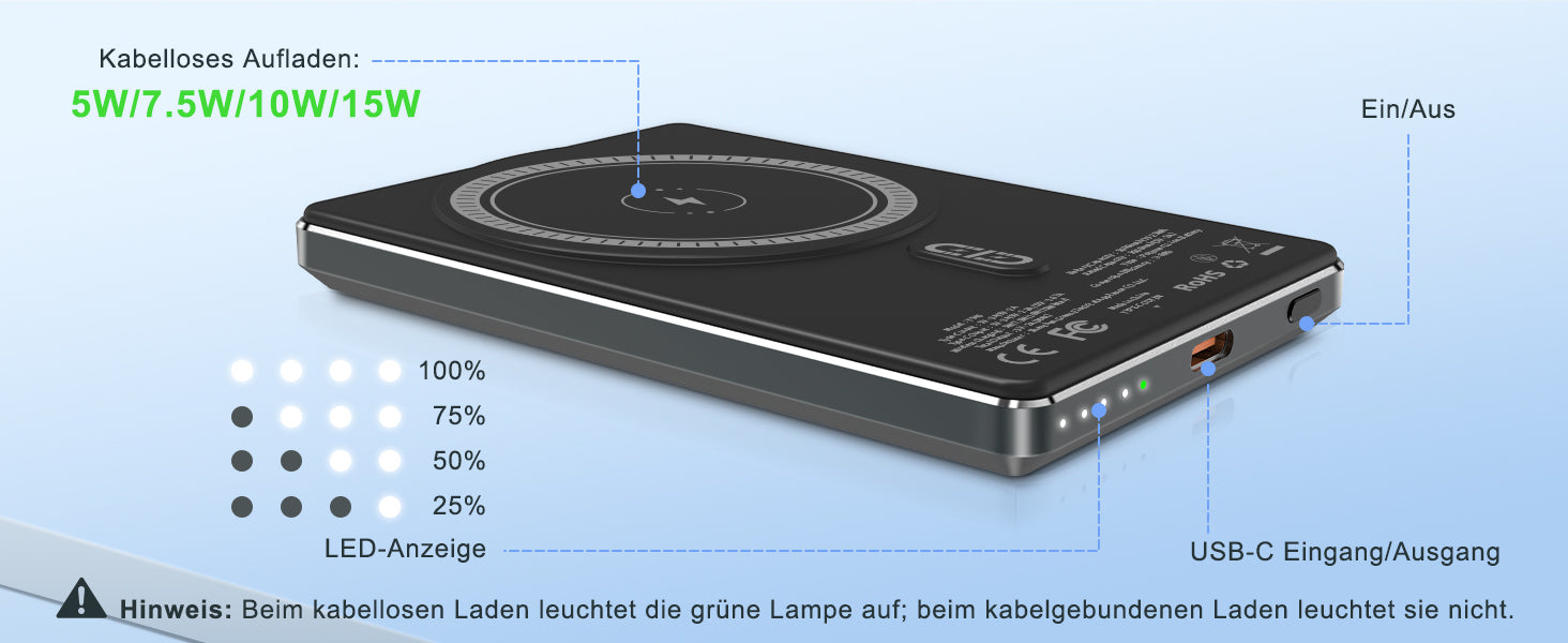Your energy companion on the go: Compact, elegant and powerful, this portable wireless power bank with LED indicator is the ultimate travel essential. Keep your devices ready to go whether you're on a long flight, working elsewhere or exploring new places.